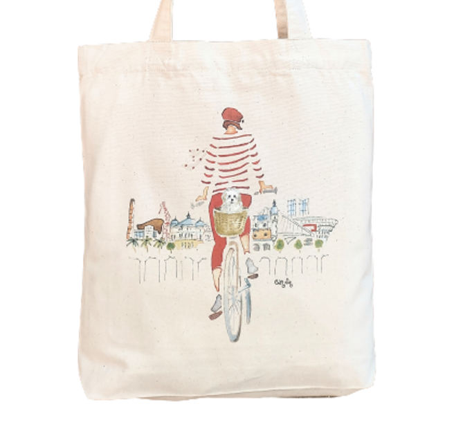 Bolsa tote bag de asas largas En bici por Bilbao (STANLEY & STELLA TOTE BAG STAU760 NATURAL) con impresión digital de una acuarela original de Elena Ciordia. El motivo de la acuarela es Una mujer y su perro dan un paseo en bici por Bilbao, descubriendo lugares emblemáticos de la ciudad.