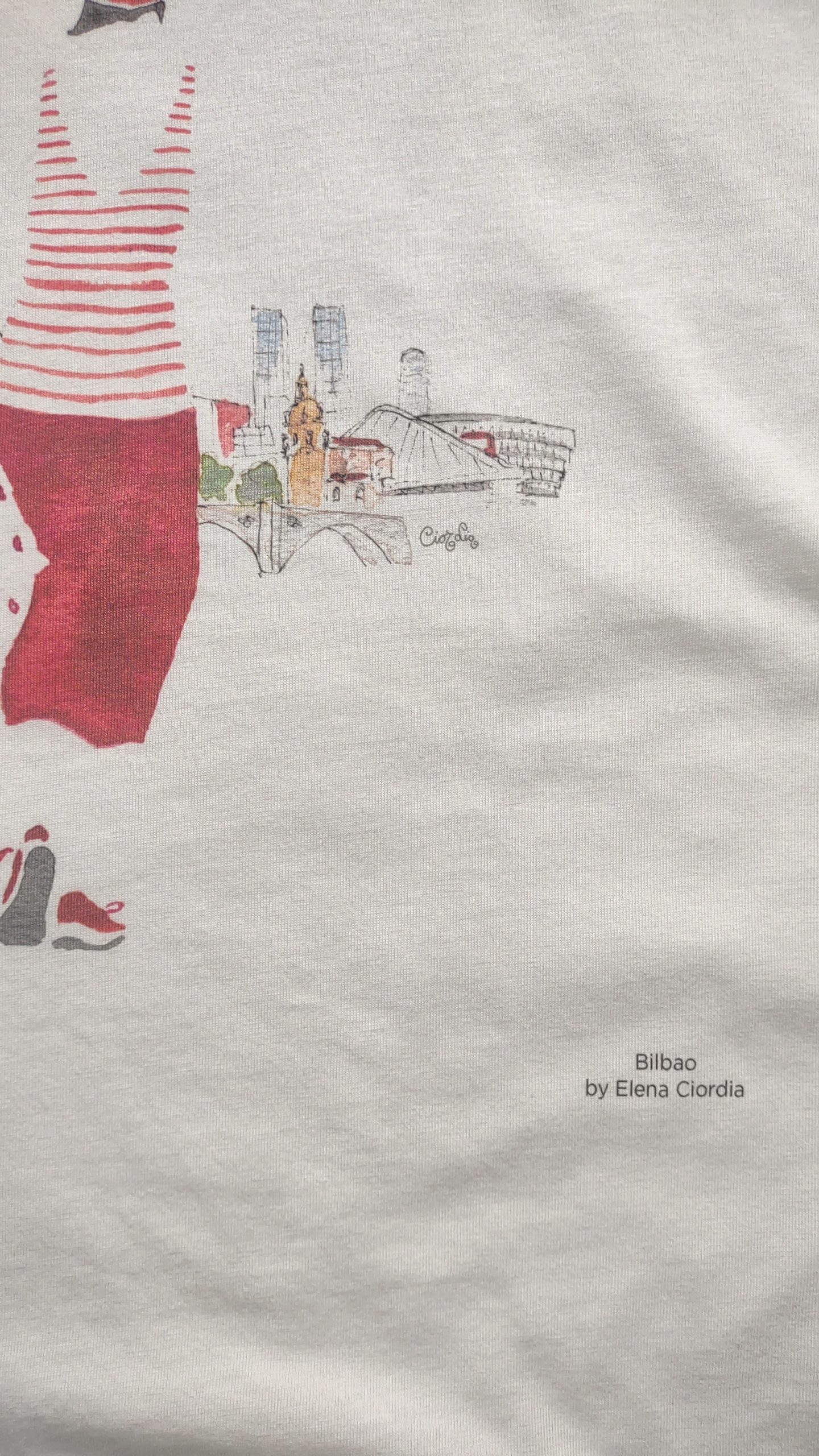 Camiseta Bilbao de mujer (Continental Clothing Company EP16) con la manga enrollada con impresión digital de una acuarela original de Elena Ciordia. Color stone wash white
