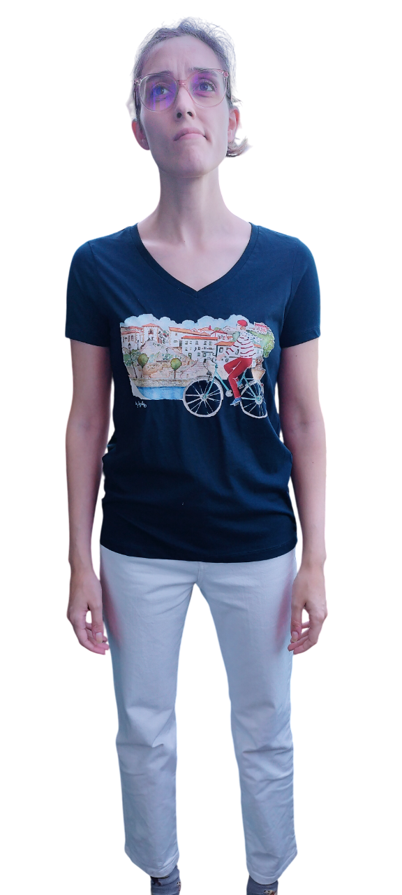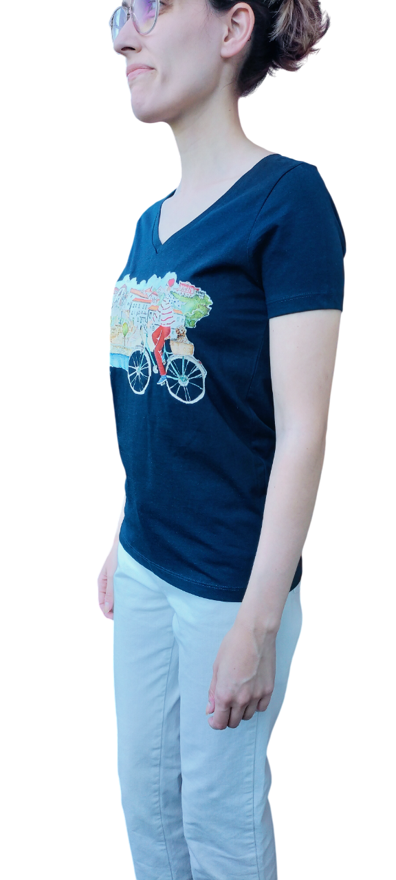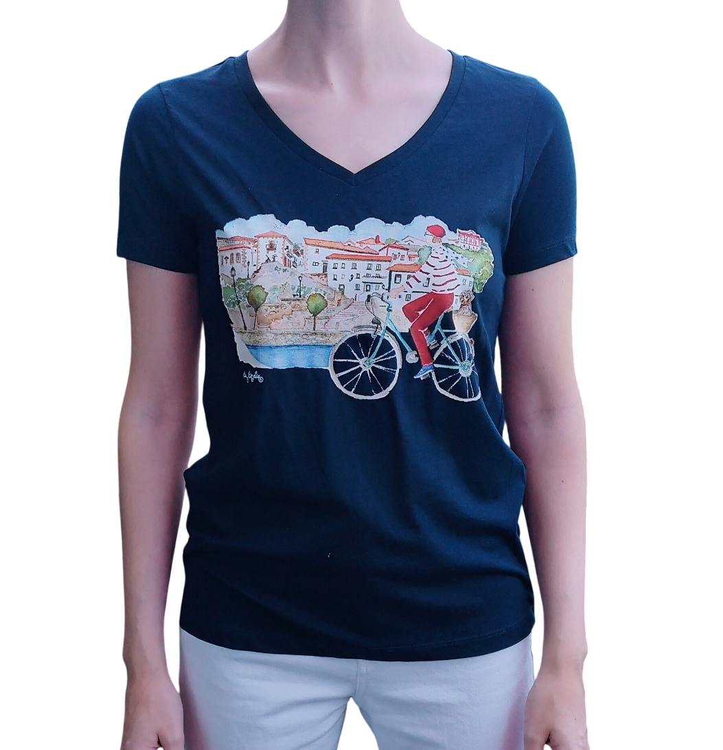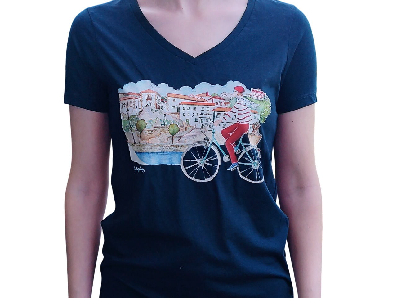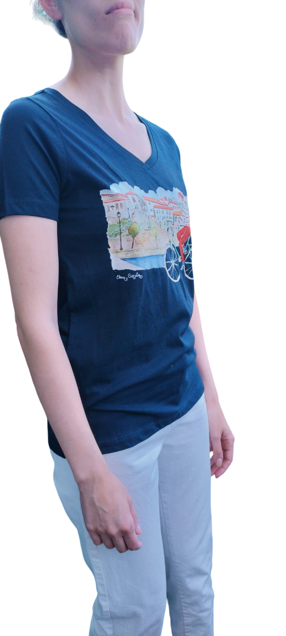 Camiseta Puerto Viejo escote en pico azul (Camiseta Orgánica Inspire cuello V mujer) con impresión digital de una imagen original de Elena Ciordia. Color Navy.