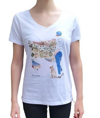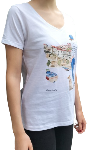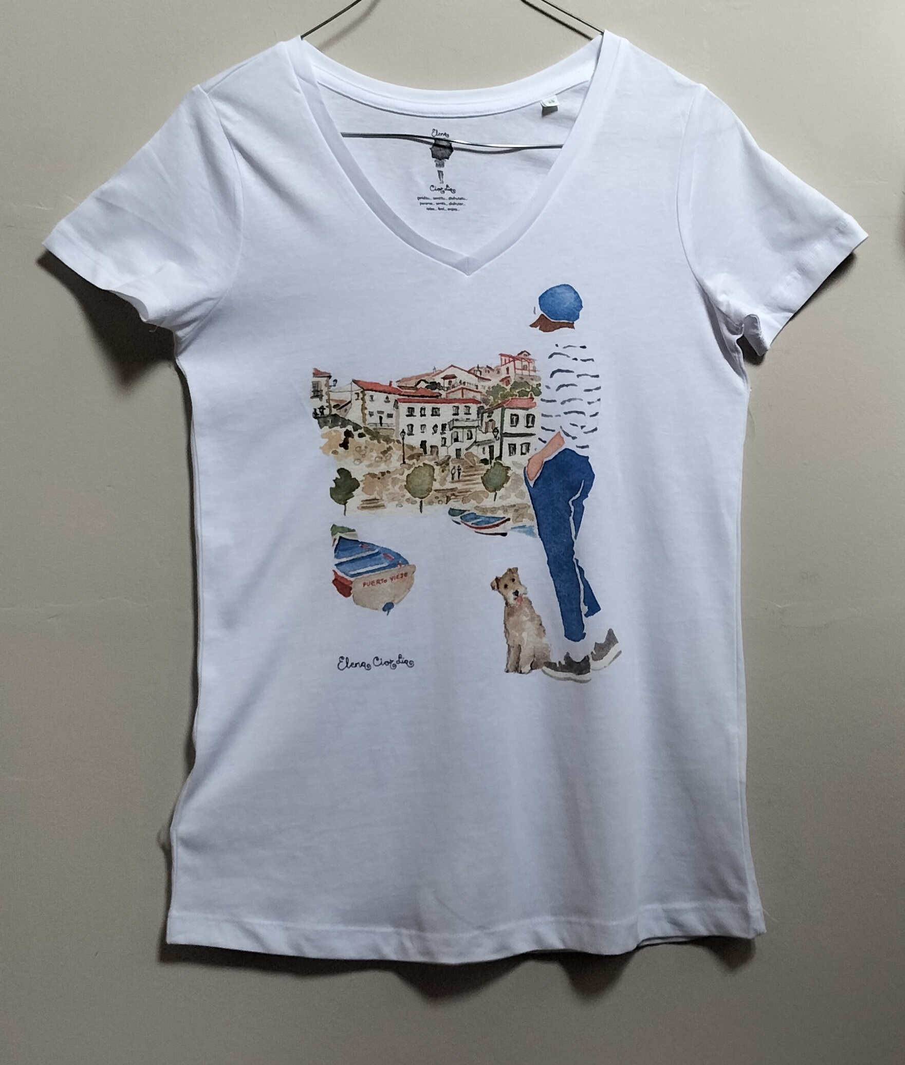 Camiseta Puerto Viejo escote en pico (Camiseta Orgánica Inspire cuello V mujer) con impresión digital de una imagen original de Elena Ciordia. Color Light Grey.
