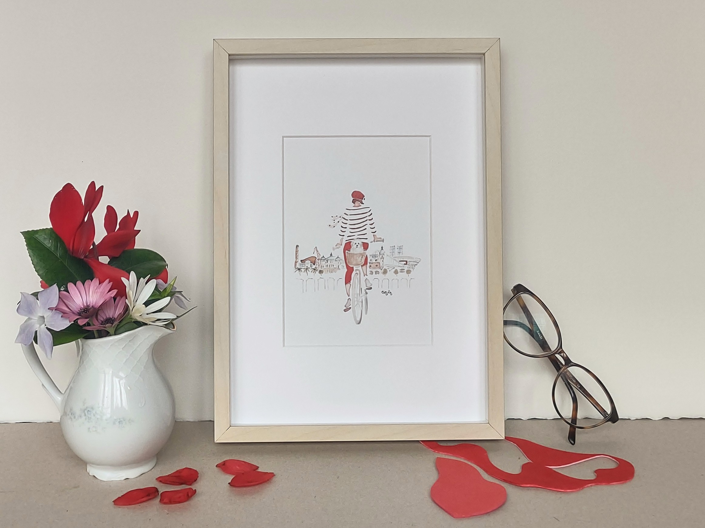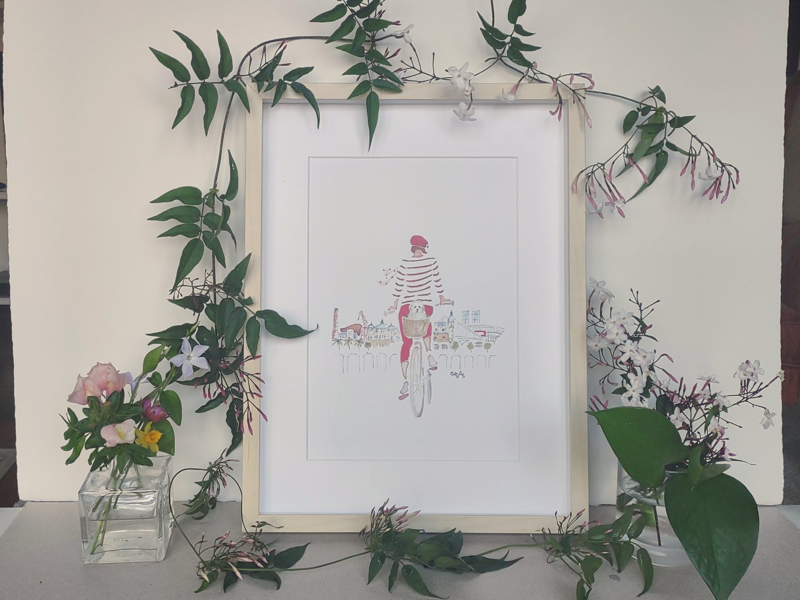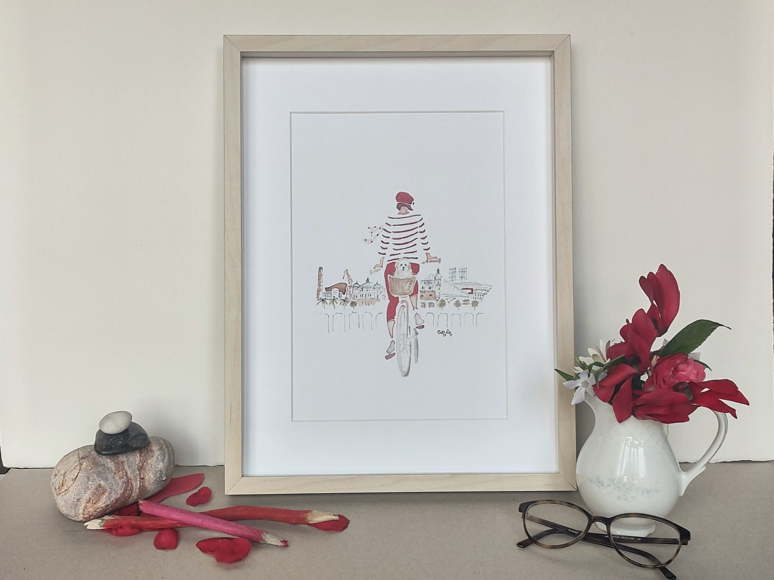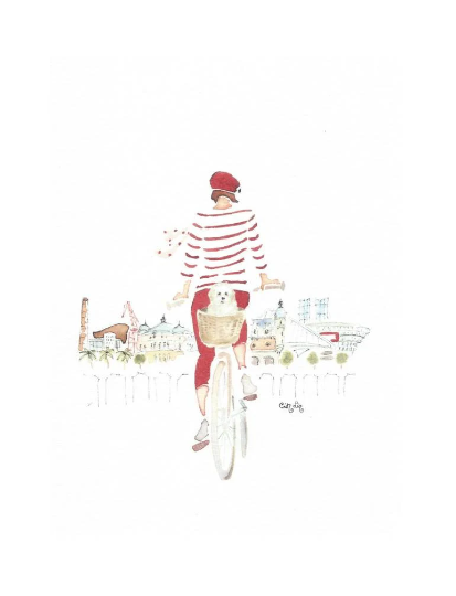 A woman and her dog take a bike ride through Bilbao, discovering emblematic places of the city. Print based on a watercolor by Elena Ciordia