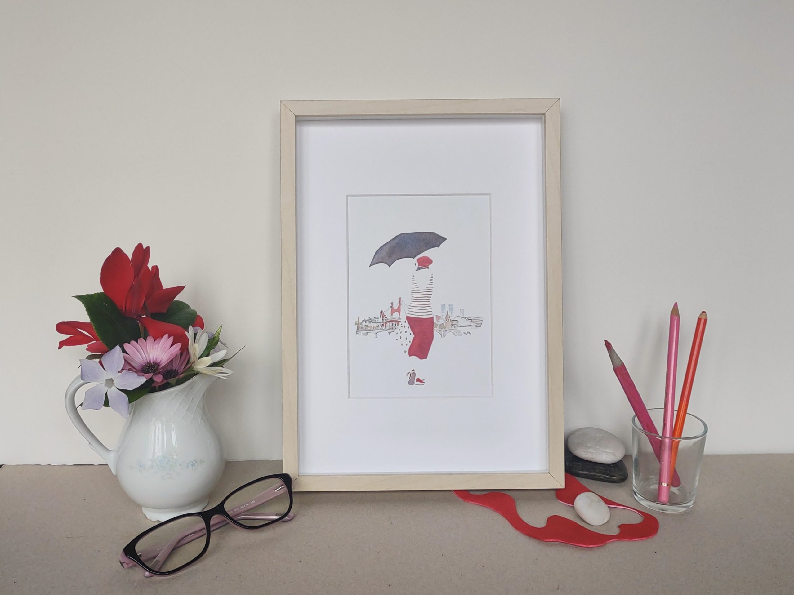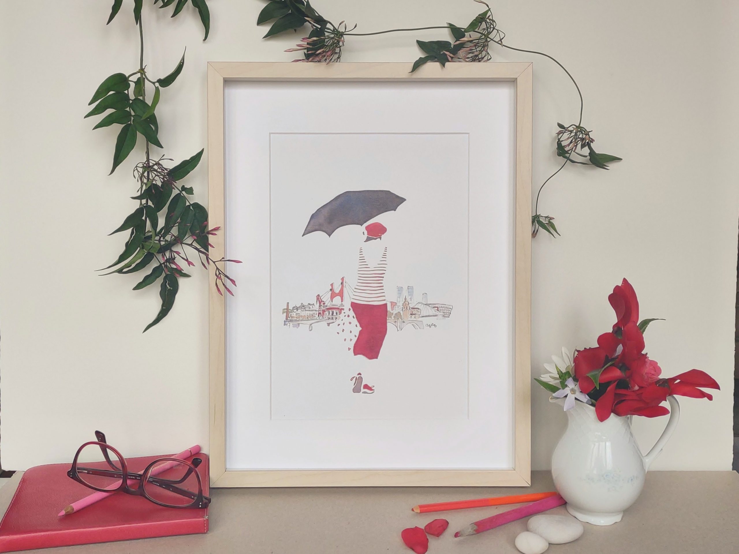 Walking at Bilbao, under the umbrella, and looking at some very representative places. Print based on a watercolor by Elena Ciordia