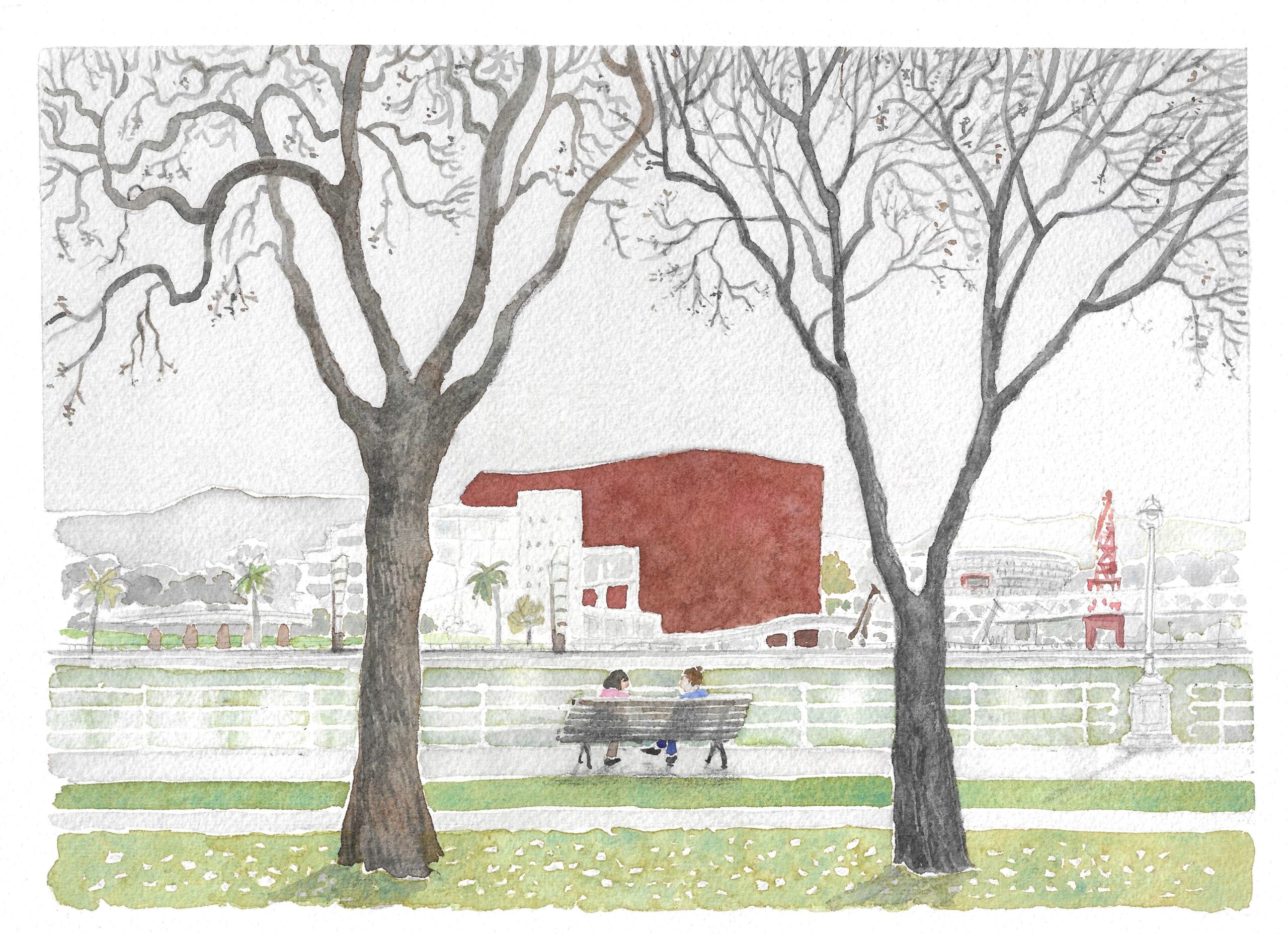 Acuarela Palacio Euskalduna Jauregia desde la ría original de Elena Ciordia. Elena Ciordiak eginiko akuarela. Watercolor by Elena Ciordia.