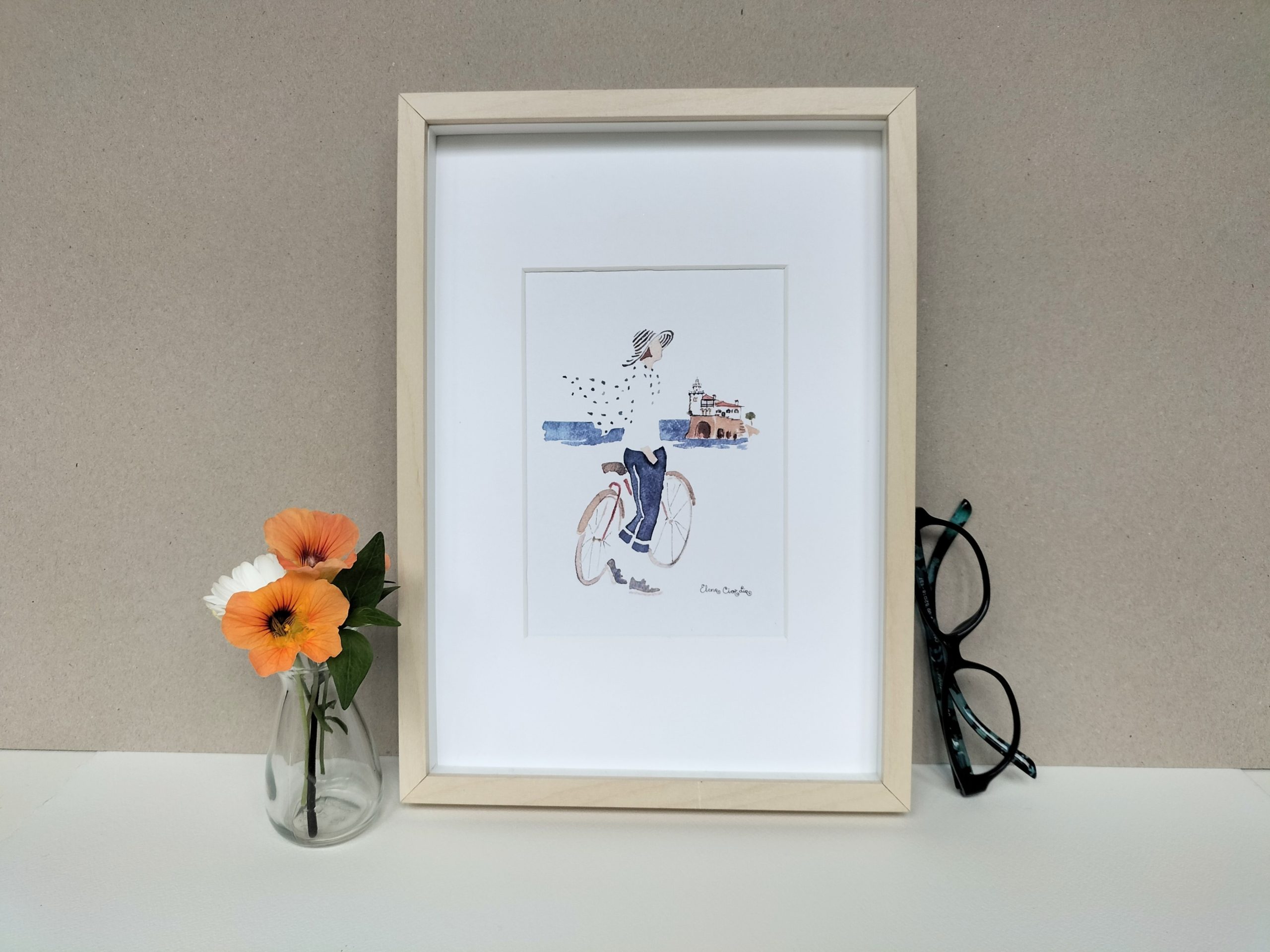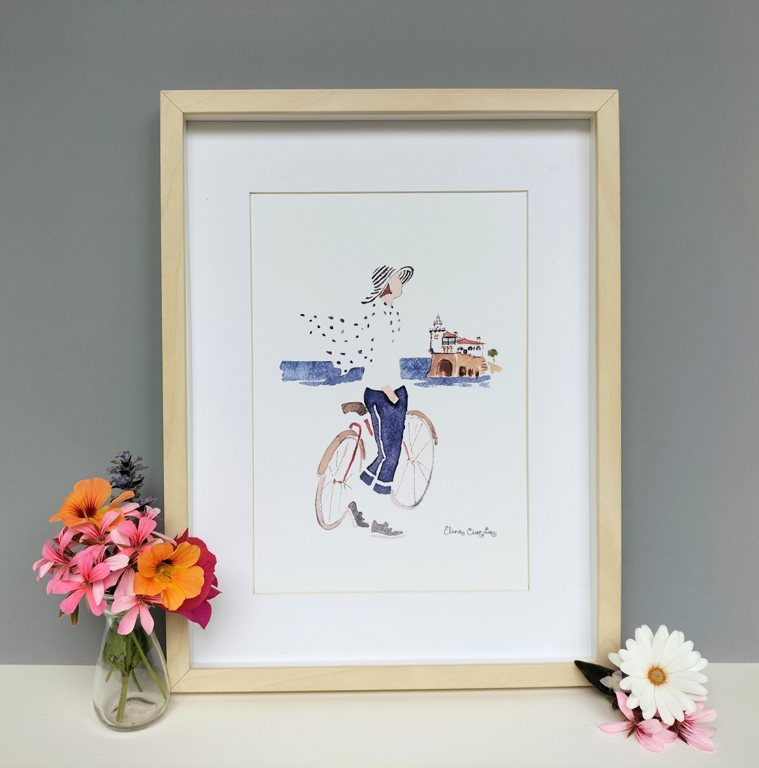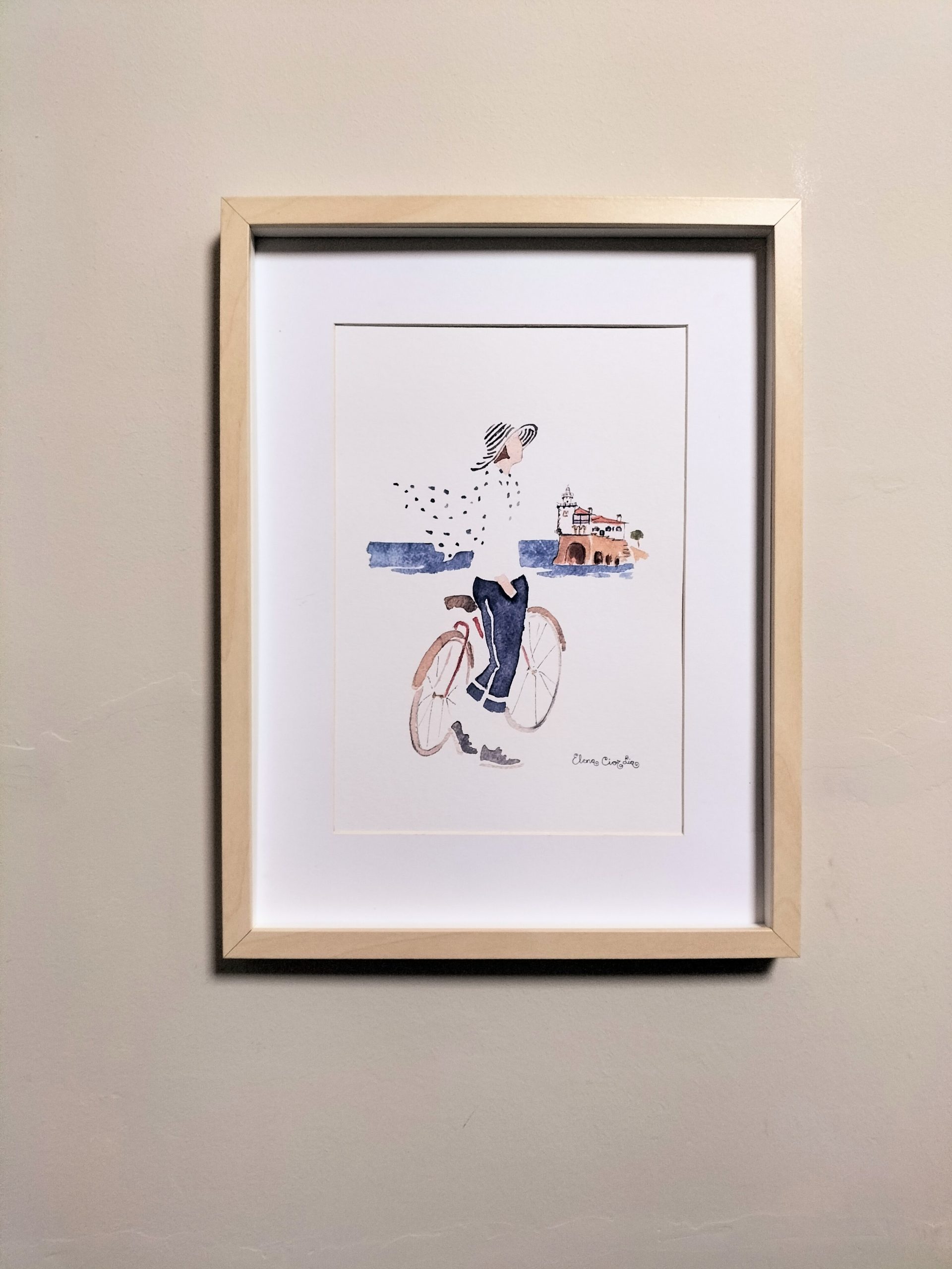 Riding the bike near Arriluze, enjoying the breeze and the sun. Print based on a watercolor by Elena Ciordia