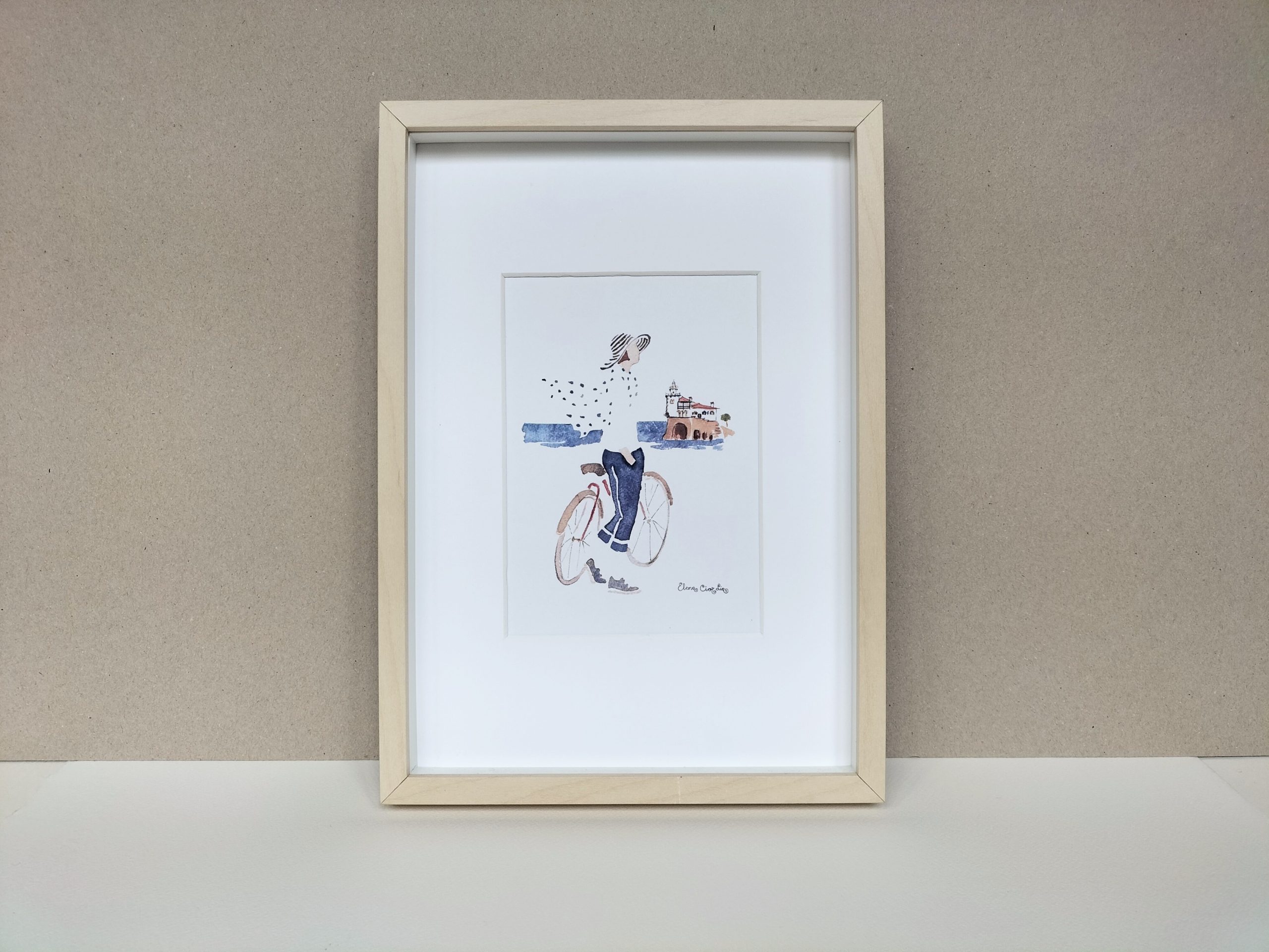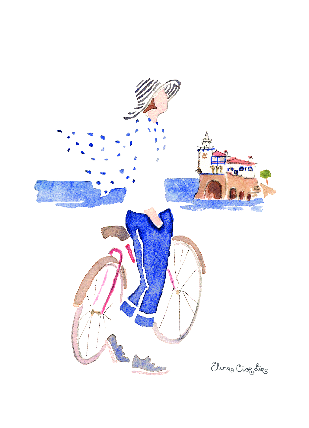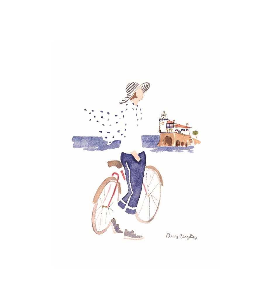 Arriluzetik bizikletaz, itsas haizeaz eta eguzkiaz gozatuz. Elena Ciordiak margoztutako akuarela batekin eginiko lamina.
